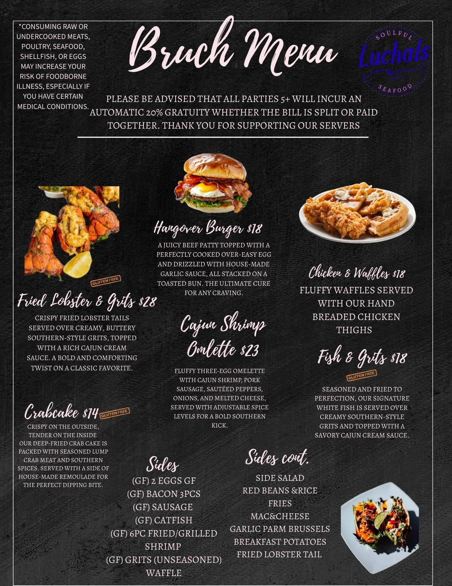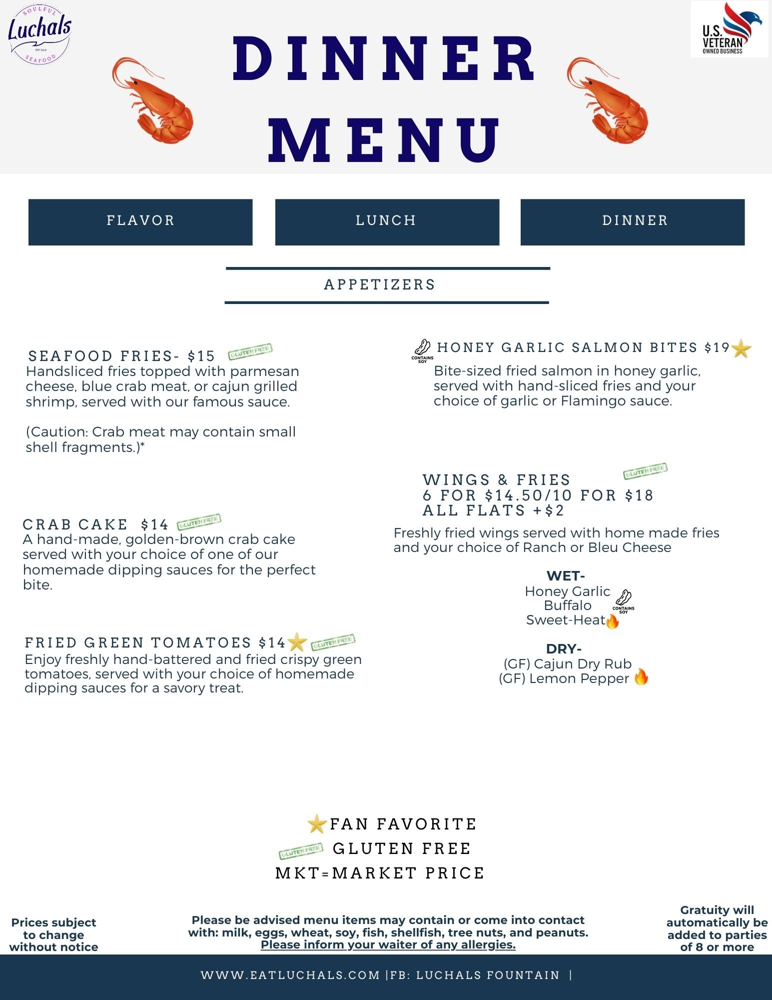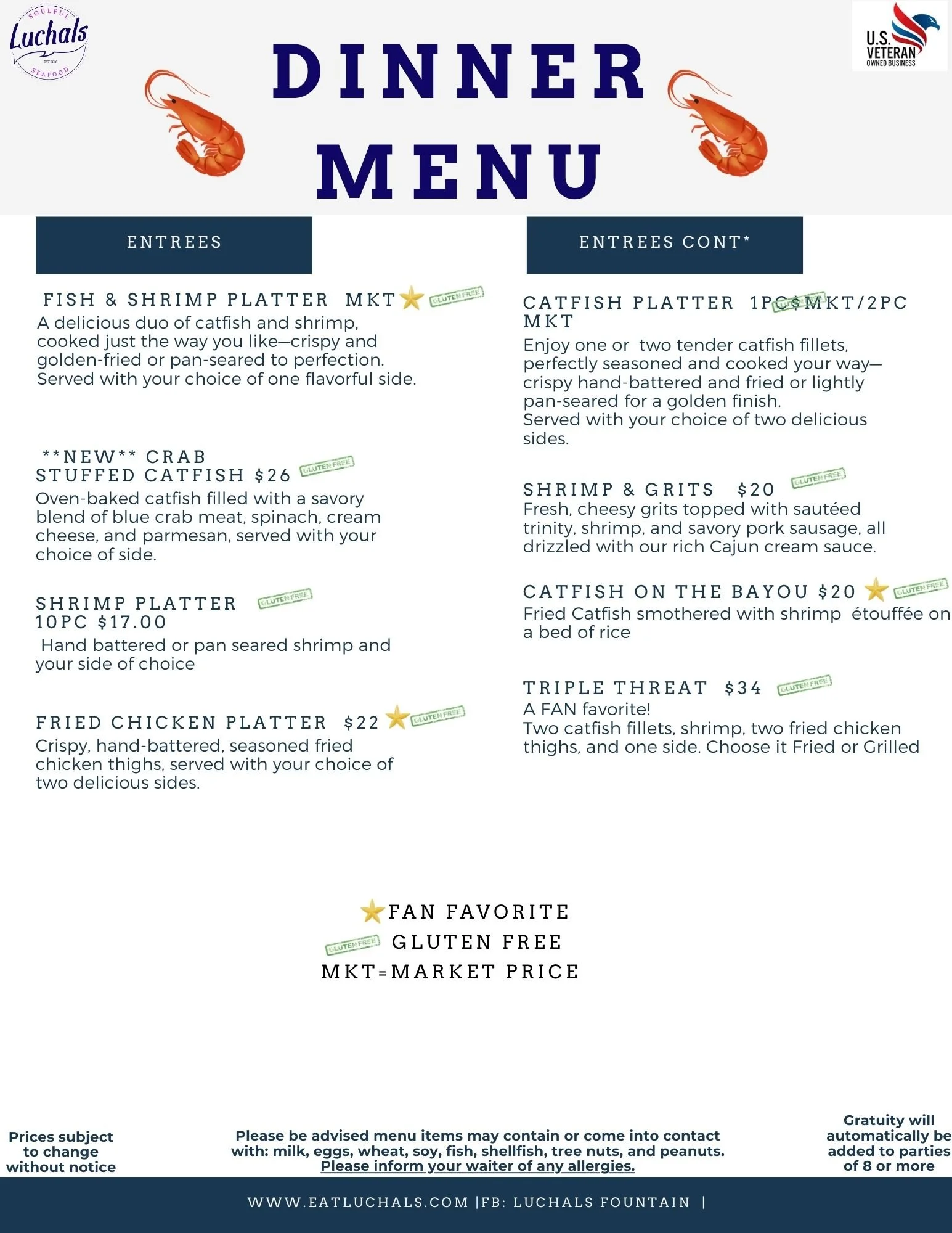 Our menu is a tribute to both the ocean's bounty and the richness of Southern cuisine. From the iconic Catfish Platter to the fiery zest of our Honey Hot Shrimp, each bite encapsulates the very essence of Southern excellence. We're proud to offer gluten-free options (GF), ensuring everyone can enjoy the flavors that define us.