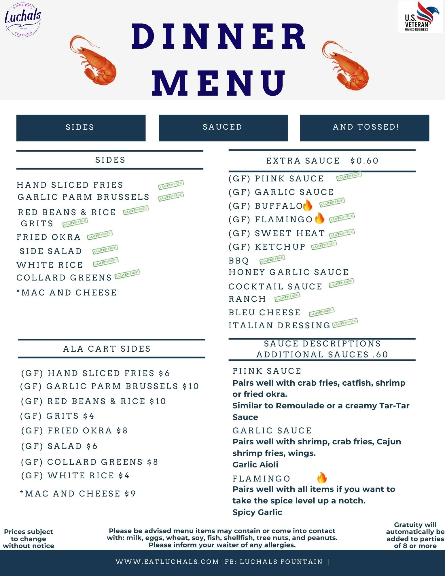 Sauce, Garlic Sauce, Flamingo Sauce, Sweet Heat, Honey Garlic, Luchals Buffalo, Ketchup (free)